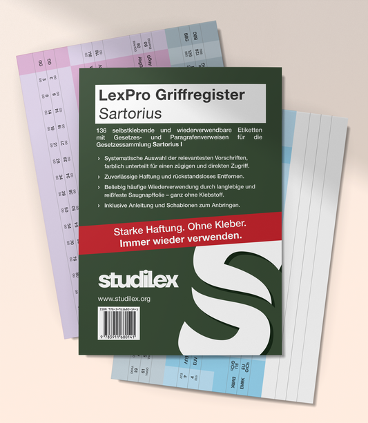 LexPro ist unser hochwertiges Griffregister, das mithilfe von Saugnapftechnologie ohne Kleber auskommt. Die Register lassen sich immer wieder repositionieren und bieten auch bei intensiver Nutzung einen stabilen Halt.
