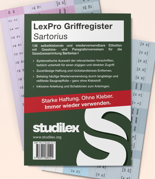 LexPro ist unser hochwertiges Griffregister, das mithilfe von Saugnapftechnologie ohne Kleber auskommt. Die Register lassen sich immer wieder repositionieren und bieten auch bei intensiver Nutzung einen stabilen Halt.