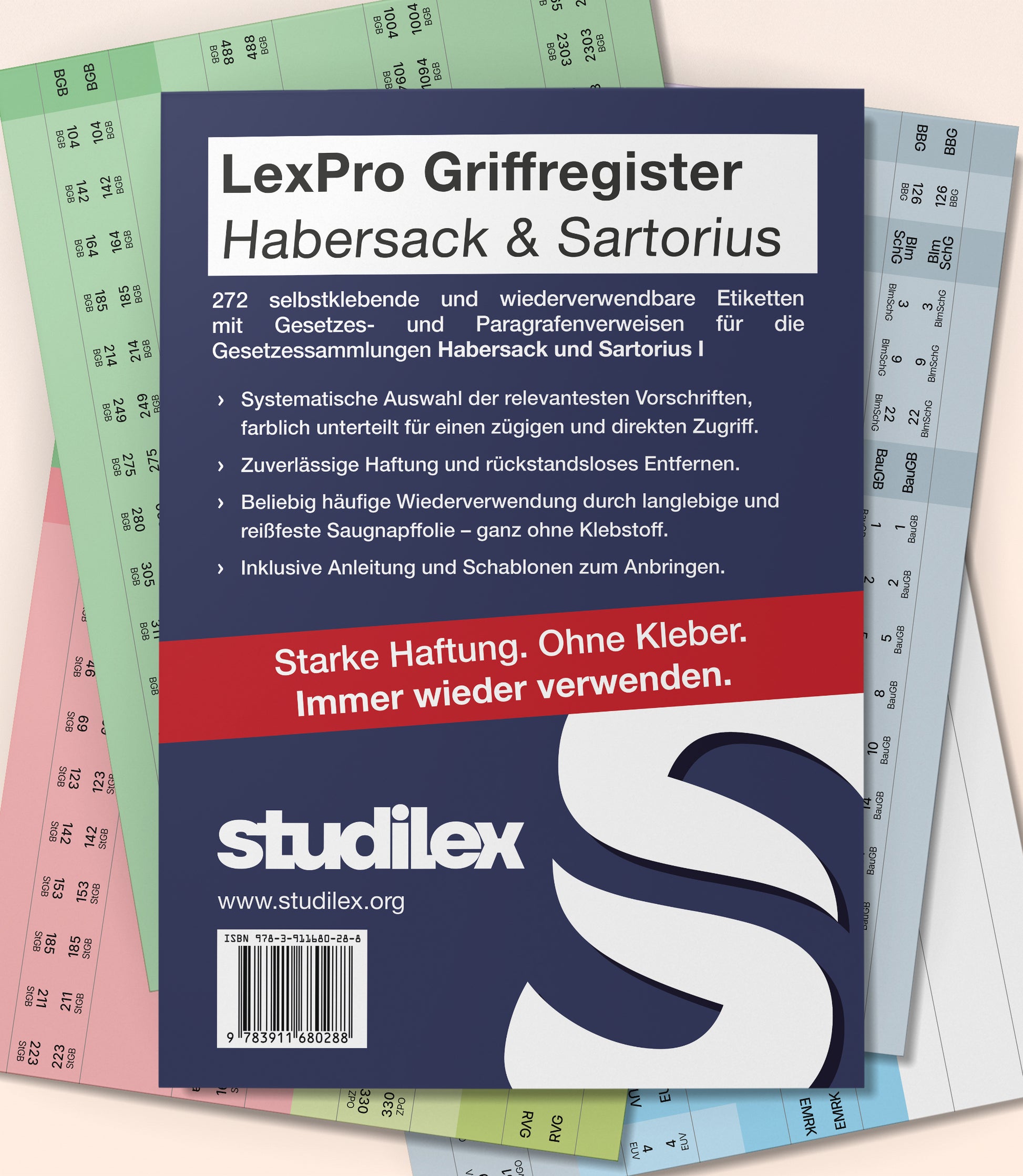 Das Griffregister LexPro Habersack & Sartorius enthält 272 selbstklebende und wiederverwendbare Etiketten mit Verweisen auf die wichtigsten Gesetze und Paragraphen aus beiden Gesetzessammlungen.